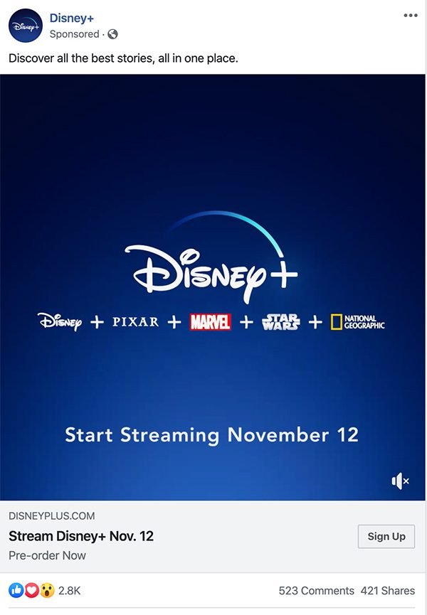Bayangkan Anda sedang scroll Facebook, tiba-tiba muncul iklan Disney+ dengan: